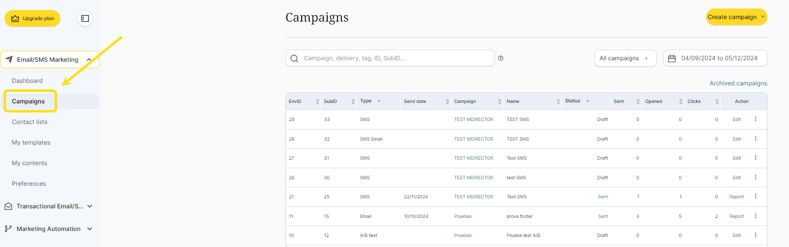 1. Go to the Email/SMS Marketing section on the left side menu and select “Campaigns”: