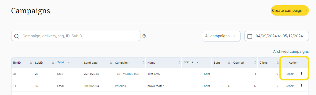 2. Click on the “Report” link in the “Actions” column on the specific SMS Campaign you want to view.