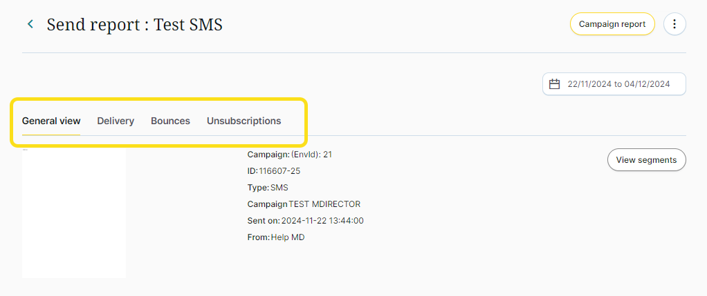 - General overview of the sent content, featuring information like: sent SMS ID, status, date sent, relevant campaign, sender and tags used.
