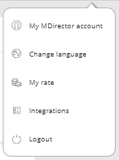 1- When logging into your MDirector account access the "Integrations" section by clicking on your name at the top right: