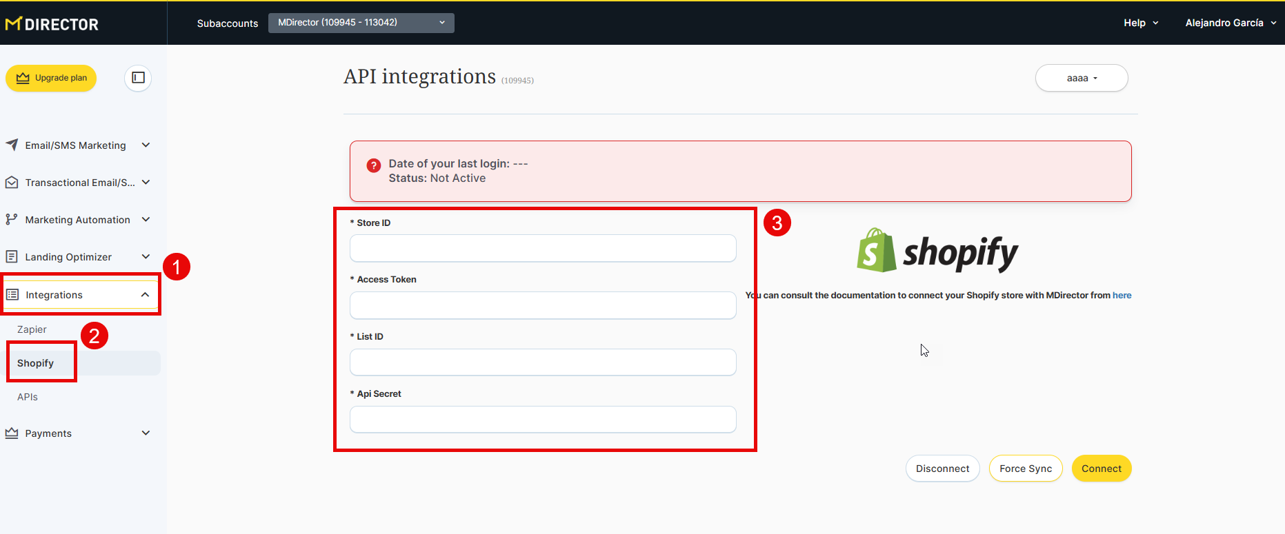 - When disconnecting the application all data is deleted so it is advisable to save the API information from both Shopify and MDirector before disconnecting.