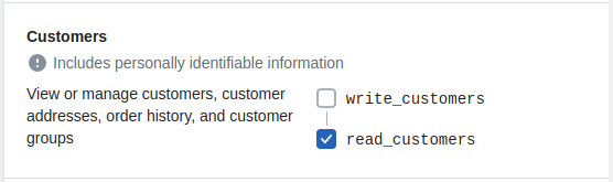 9- On the next screen select the permissions the app needs. In this case it will only need to have permission to "read_customers":