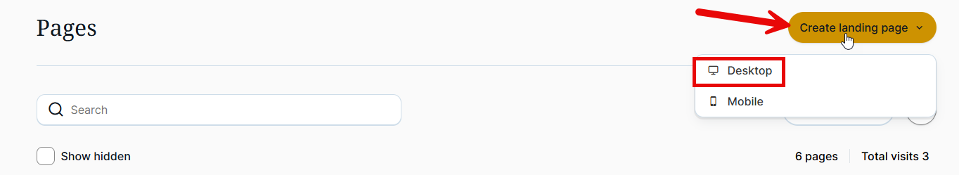 2. Create a new desktop landing page by clicking the "Create landing page" button located in the top-right corner of the screen.