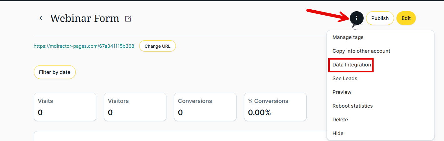 9. Integrate your landing page data with your bulk email contact list. To do this, go to the three-dot menu (top-right) under "Data integration: