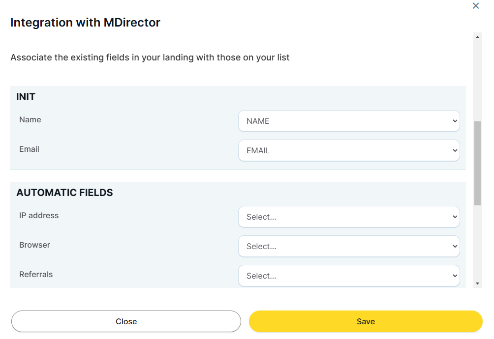 Select the contact list to receive the data, and then choose the fields you want to include. Ensure that both the list and the fields have already been created in the Contact List panel of your Email Marketing service: