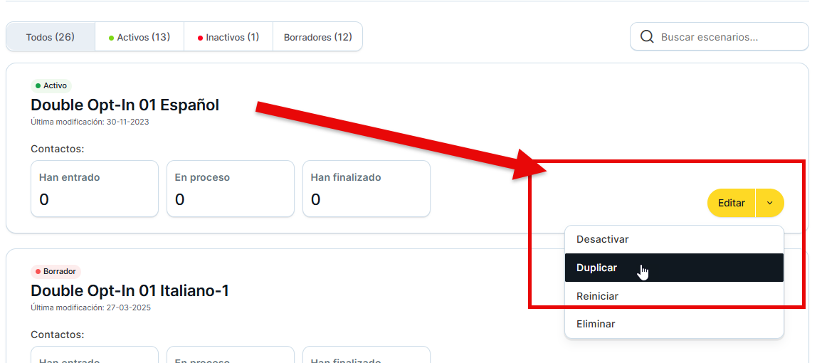 Para duplicar un escenario, debemos hacerlo desde el listado. Primero, localizamos la tarjeta del escenario deseado y hacemos clic en la flecha a la derecha del botón "Editar", que despliega el menú de acciones. Luego, seleccionamos la opción "Duplicar".