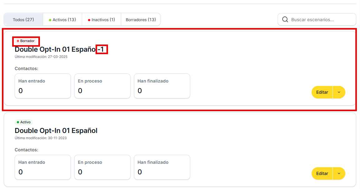 Observaremos que se ha creado el nuevo escenario en el listado en estado de borrador y con el mismo nombre seguido de un "-1".