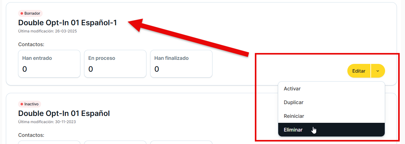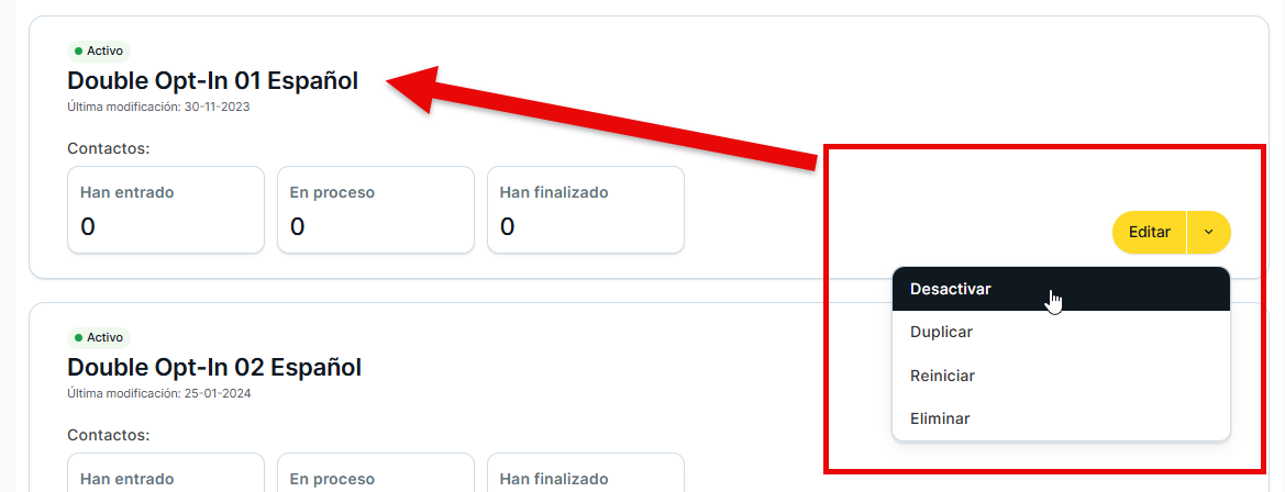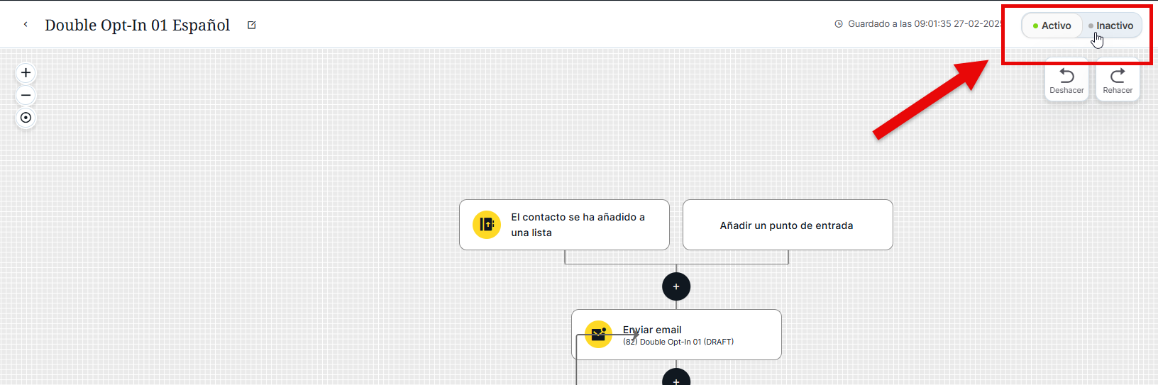 Por defecto, cuando creamos un escenario esté se muestra en estado de borrador hasta que decidamos que ya está listo para que empiece a funcionar. El proceso para desactivarlo es el mismo que seguimos en su momento para activarlo. Esto lo podemos hacer desde dos puntos: desde el listado o desde el propio escenario.