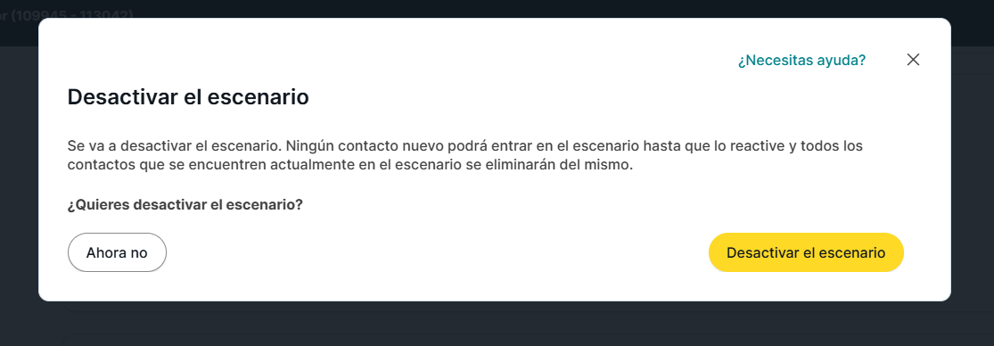 Se abrirá una ventana para confirmar la decisión. Aquí deberemos pulsar "desactivar escenario" para hacerlo, entendiendo que esta decisión implica que ningún contacto nuevo podrá entrar en el escenario hasta que lo reactives y todos los contactos que se encuentren actualmente en el escenario se eliminarán del mismo.