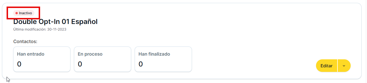 Observaremos que el estado de la card ha cambiado, donde antes había un "Activo" en verde justo encima del título, ahora hay un "Inactivo" en rojo.