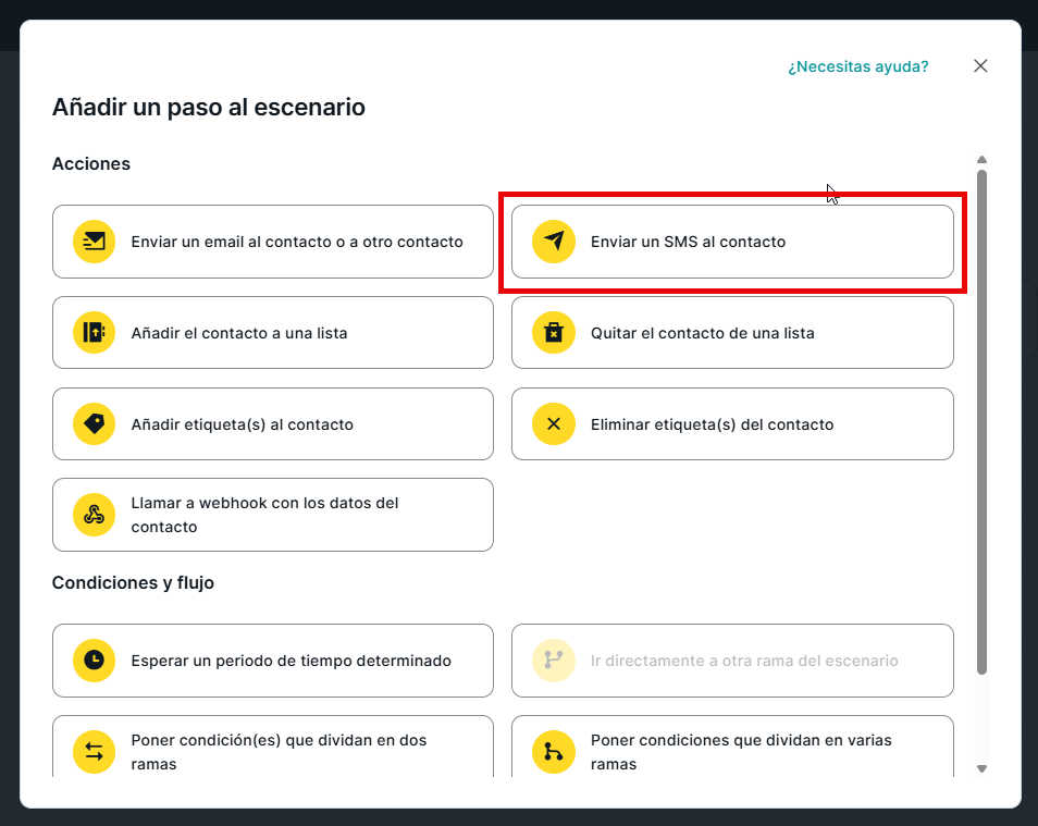 Para añadir el paso al escenario, haz clic en el botón “+” y selecciona la opción “enviar un SMS al contacto” dentro de la categoría de acciones.