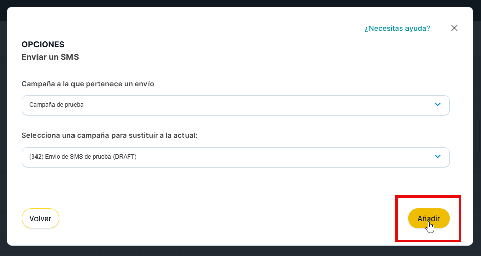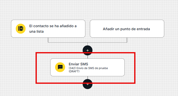 Antes de añadir este paso al escenario, es necesario crear el envío de SMS desde el módulo de Email/SMS Marketing y dejarlo en estado de borrador, sin enviarlo. Si aún no sabes cómo hacerlo, puedes consultar este artículo: https://mdtr.io/pcQBG