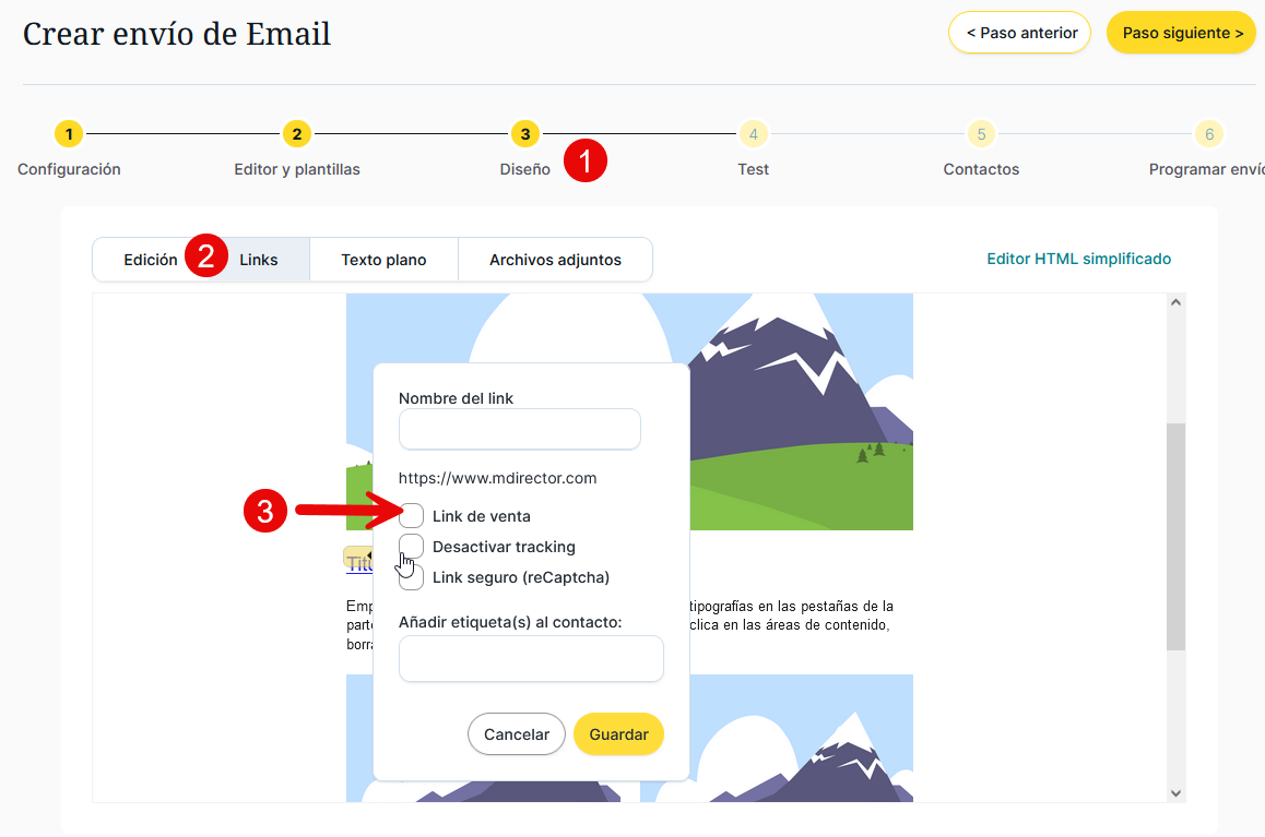 Para que funcione, has de implementar el píxel de venta dentro de tu web, en las páginas de venta. Para que se traqueen los enlaces de una comunicación y se controlen las ventas a través de esos enlaces es necesario activar cada enlace como píxel de venta dentro del paso "3. Diseño" de creación de un envío, en la pestaña “Links”. Debes de dar clic en el link correspondiente para que se despliegue la ventana correspondiente.