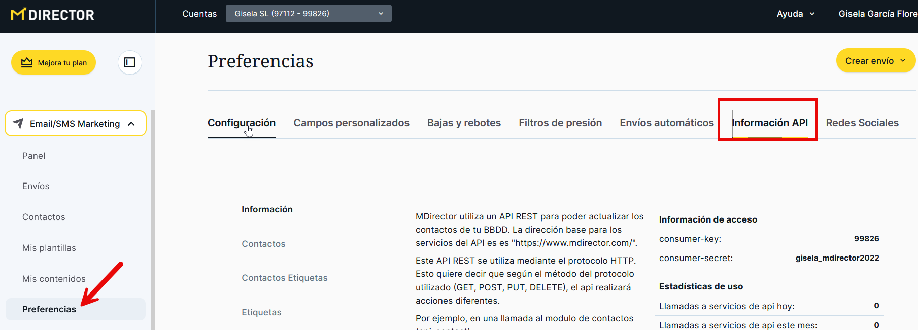 El píxel de venta es una alternativa al API de Ventas del servicio de Email Marketing. Toda la información sobre el API está incluida en las preferencias de la sección "Email Marketing", a la que podrás acceder desde el menú lateral izquierdo en la pestaña "Información API".