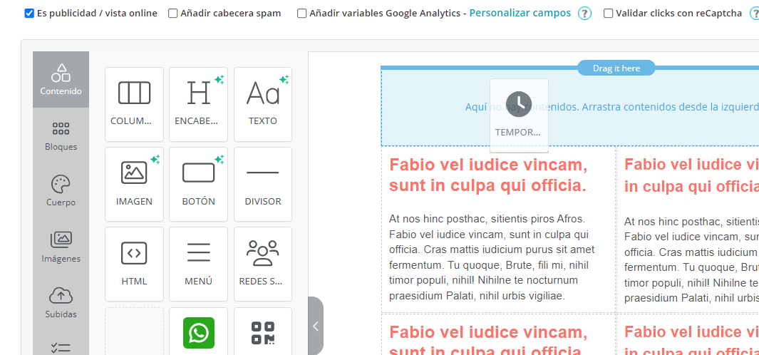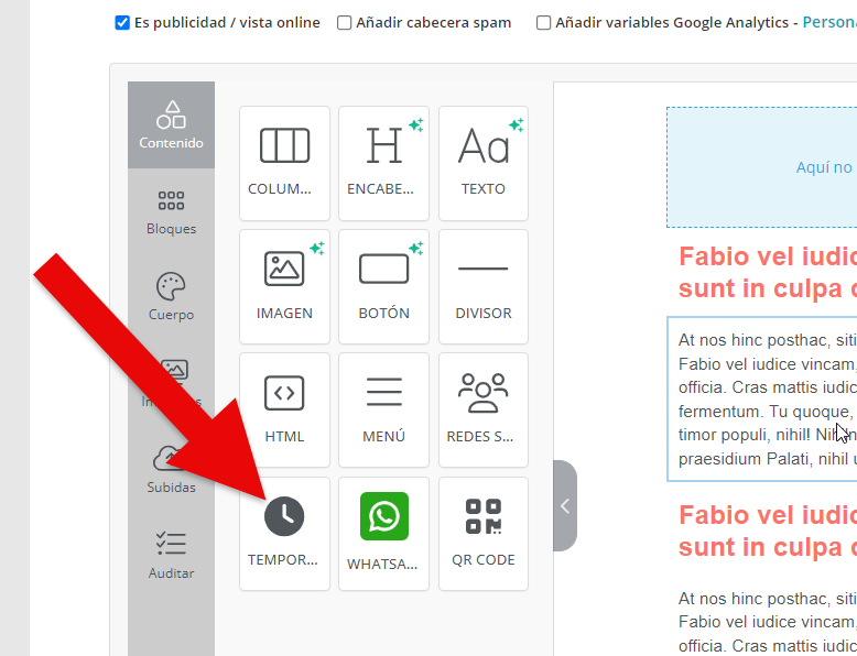 El Nuevo Editor Mejorado de MDirector ofrece la posibilidad de incorporar un temporizador —o, lo que es lo mismo, una cuenta atrás— en la creatividad de un envío de Email Marketing. Para colocarlo en la misma basta con arrastrarlo desde el panel de "Contenido" hasta el bloque donde queramos agregarlo.