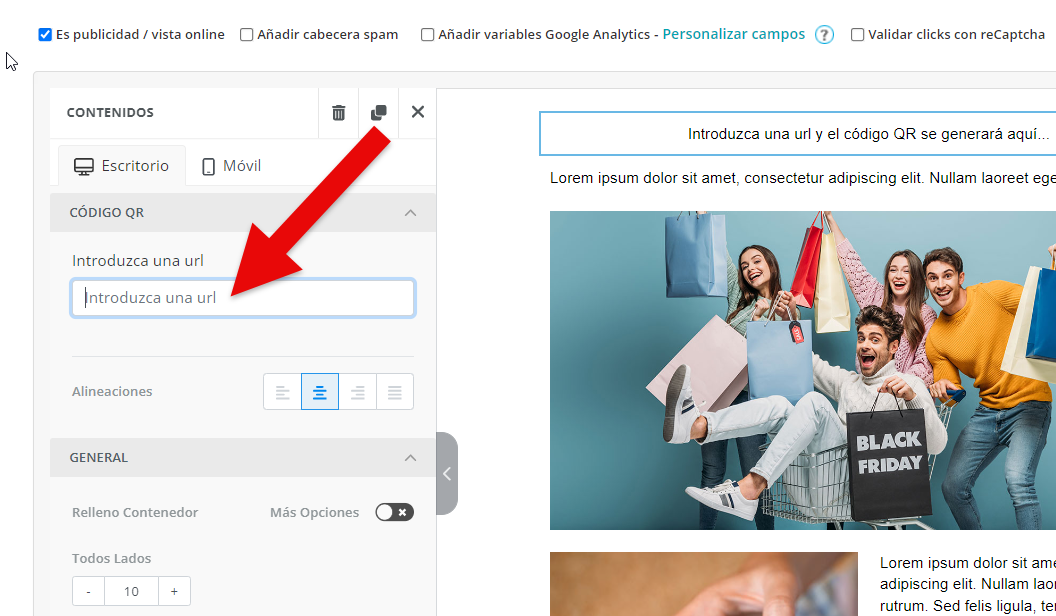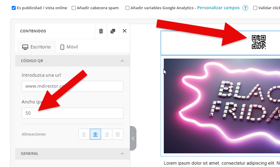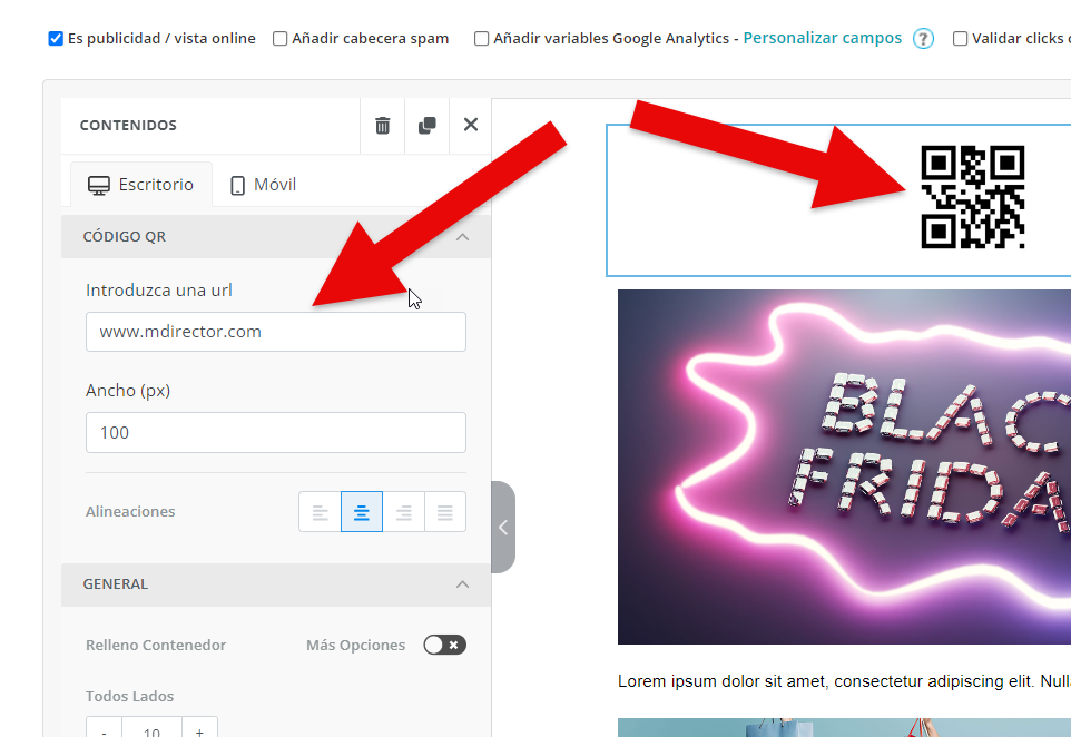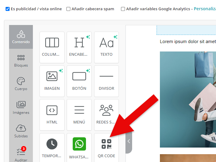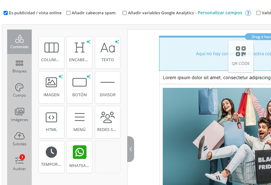 El Nuevo Editor Mejorado de MDirector ofrece la posibilidad de incorporar un código QR en la creatividad del envío de Email Marketing. Para colocarlo en la misma basta con arrastrarlo desde el panel de "Contenido" hasta el bloque donde queramos agregarlo.