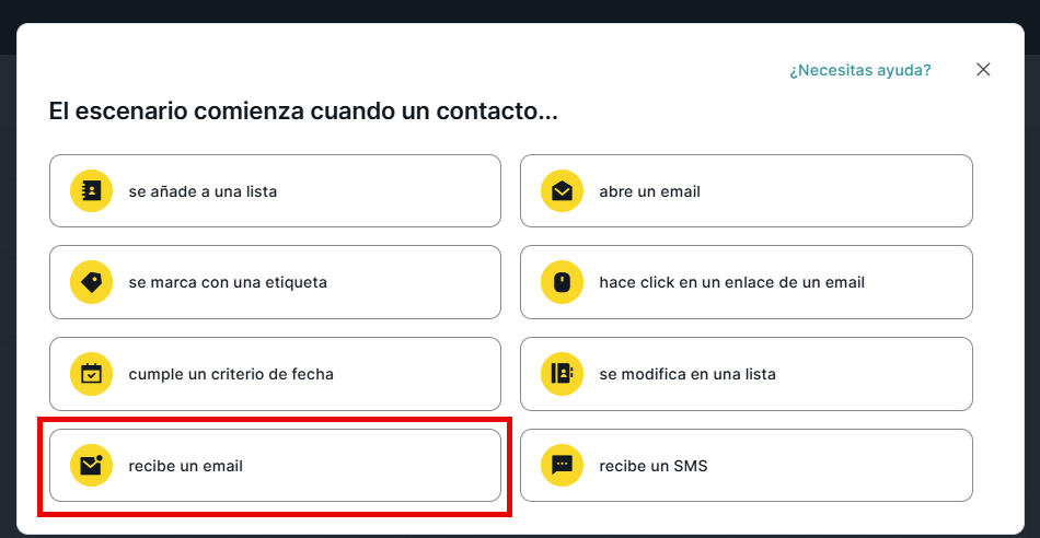 Cuando deseamos que el evento que inicie un escenario sea que un contacto reciba un determinado email, debemos configurarlo desde el punto de entrada "recibe un email".