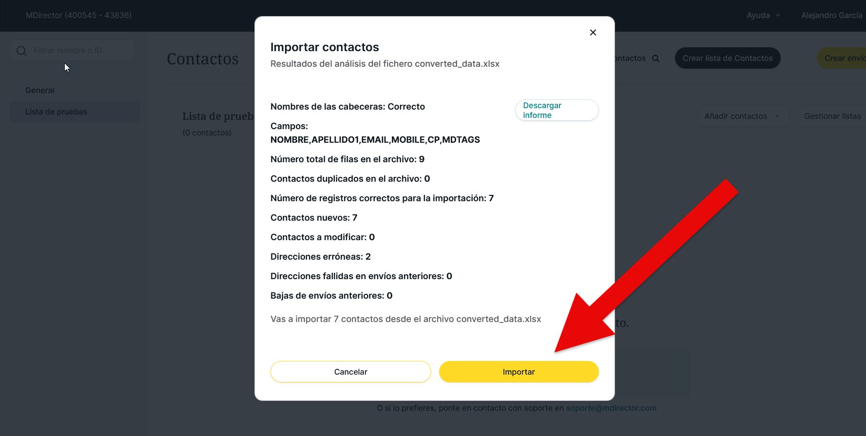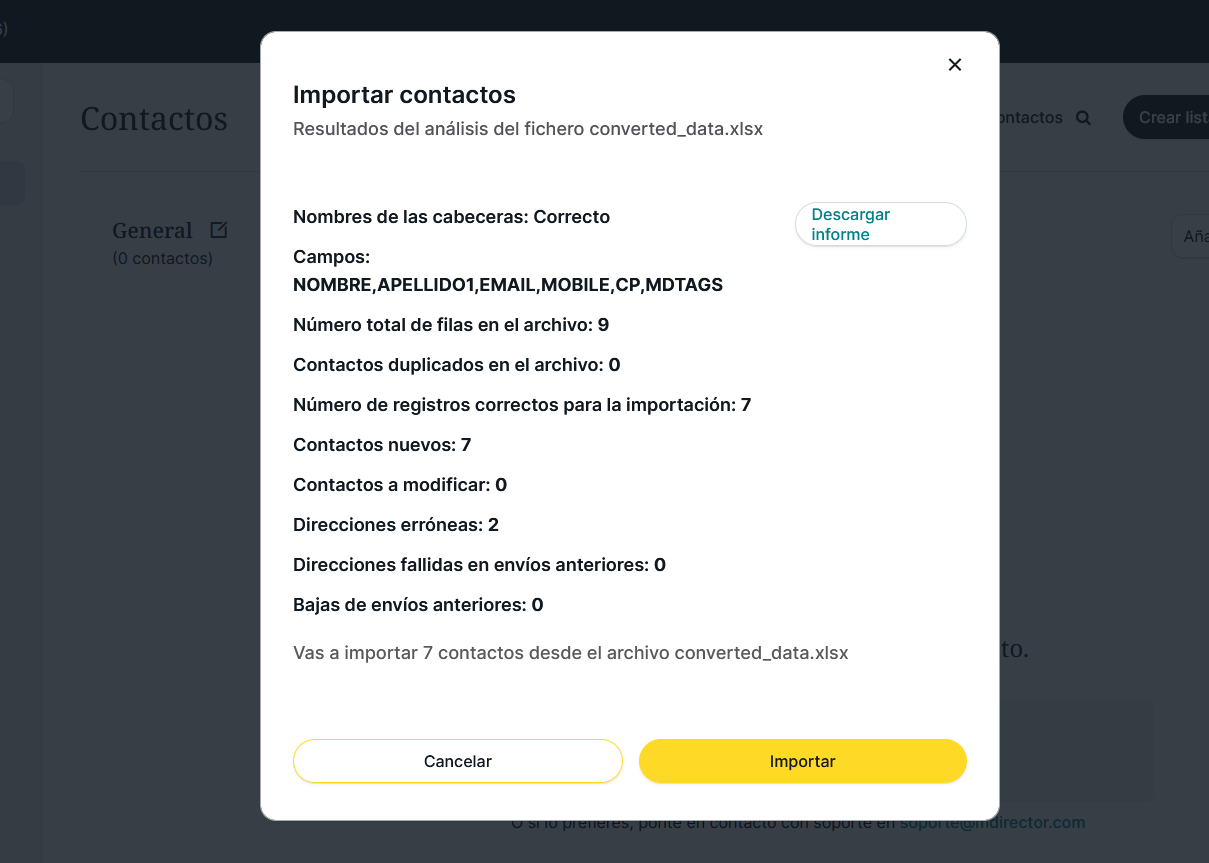 5. MDirector te ofrecerá un resultado final del análisis del fichero de los contactos que estás a punto de importar a la lista.
