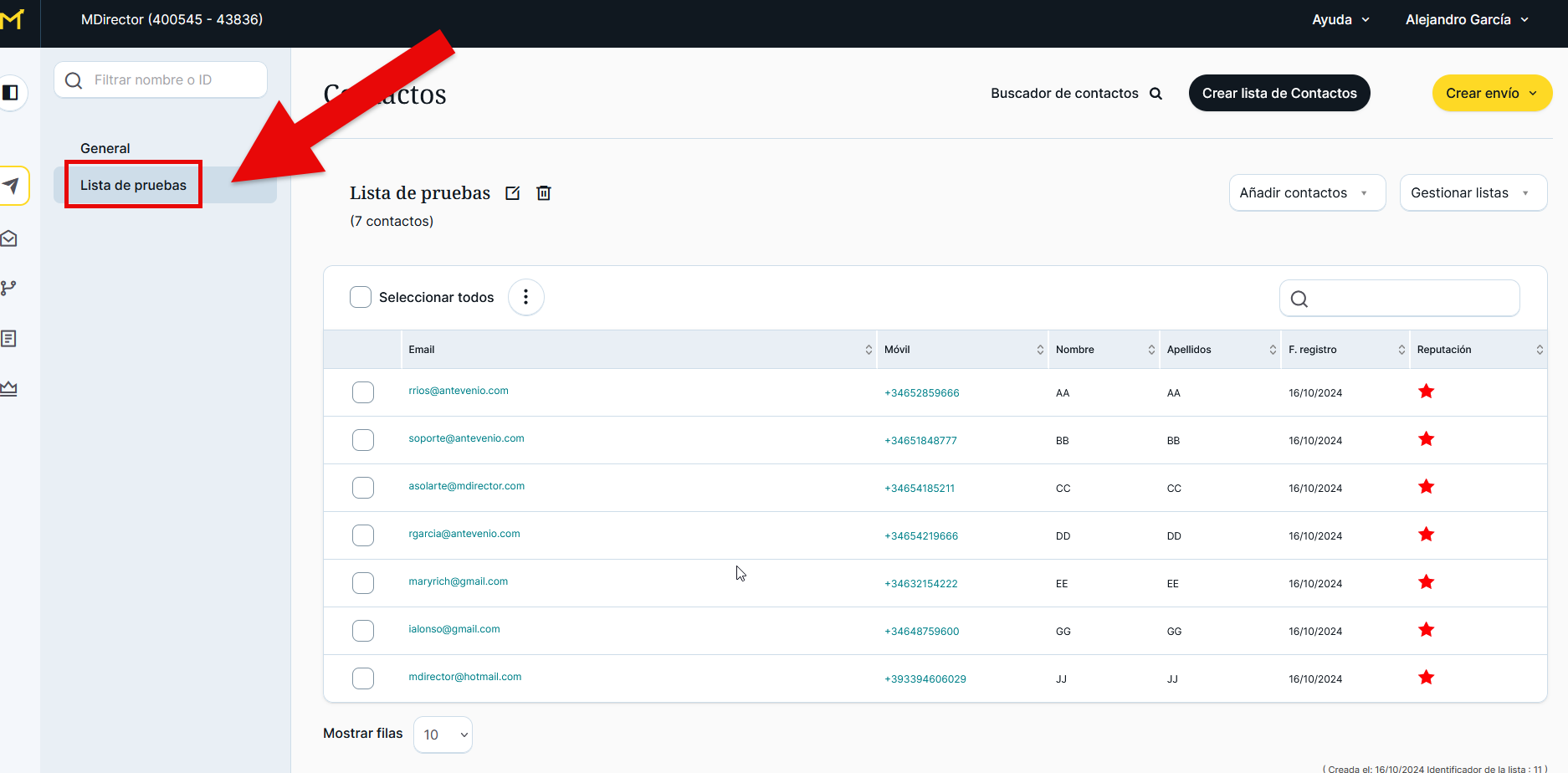 MDirector te llevará directamente a esta lista, pero para consultarla en cualquier momento, recuerda que puedes hacerlo desde el segundo menú lateral que se abre en la sección de "Contactos" del servicio de Email Marketing.