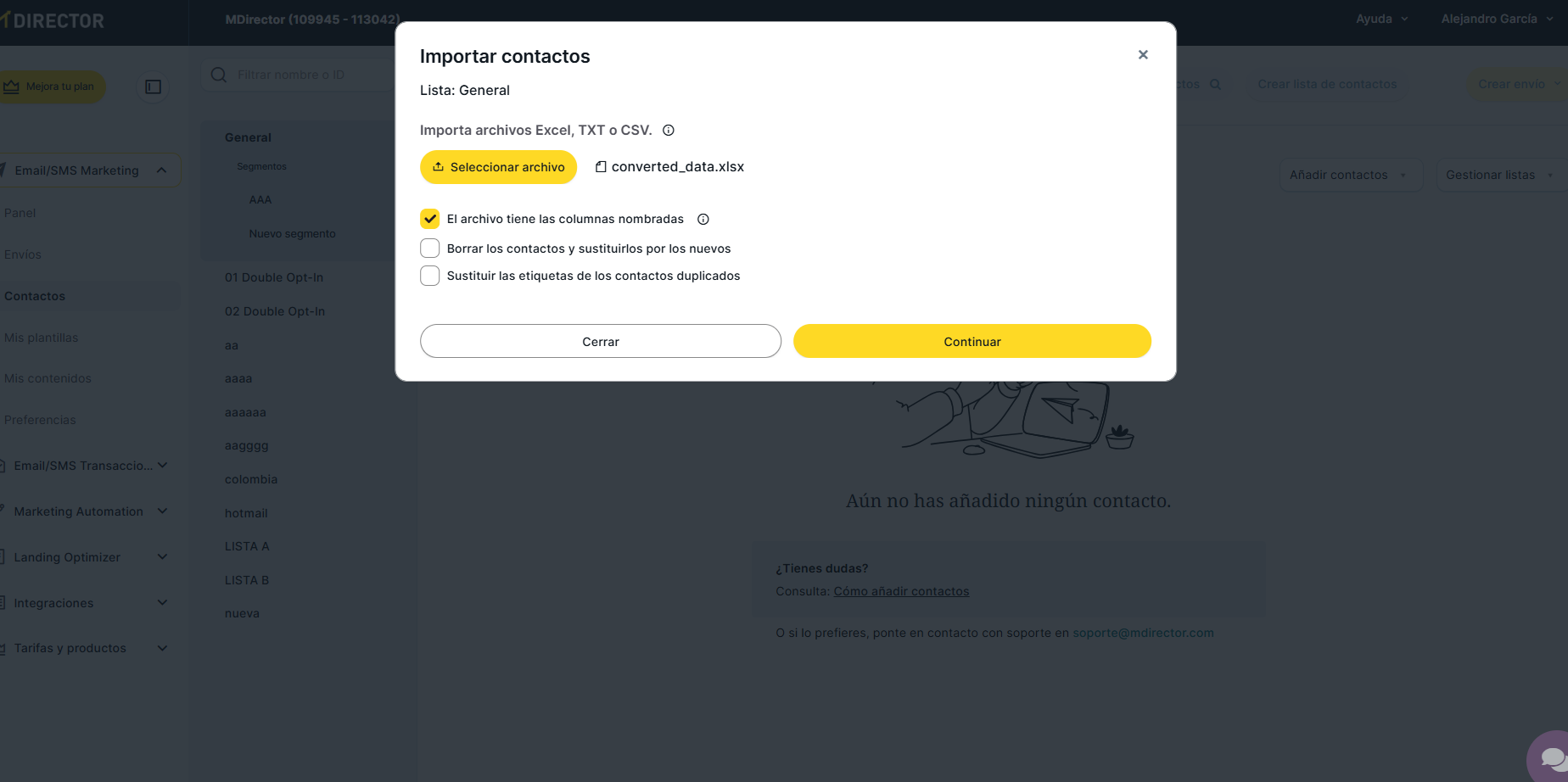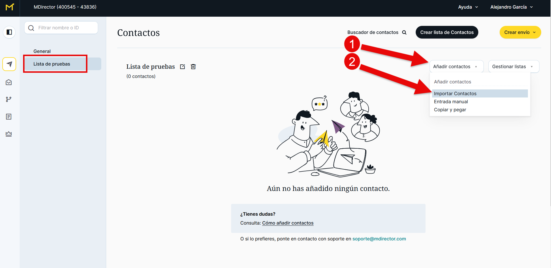 Antes de importar contactos a través de archivos, debes crear una lista de contactos o acceder a la lista "General". Si todavía no has hecho esto y no sabes cómo hacerlo, visita este artículo: https://mdirector.zendesk.com/hc/es/articles/6693916588946-Gesti%C3%B3n-de-listas-de-contactos