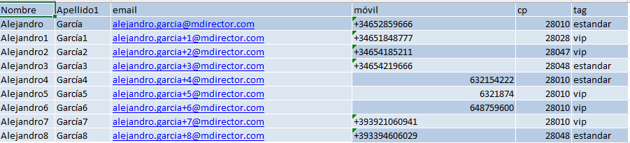 1. Para importar contactos a través de archivos, lo primero es preparar un fichero que contenga los contactos y campos que deseamos trasladar a MDirector. Aquí tienes un ejemplo: