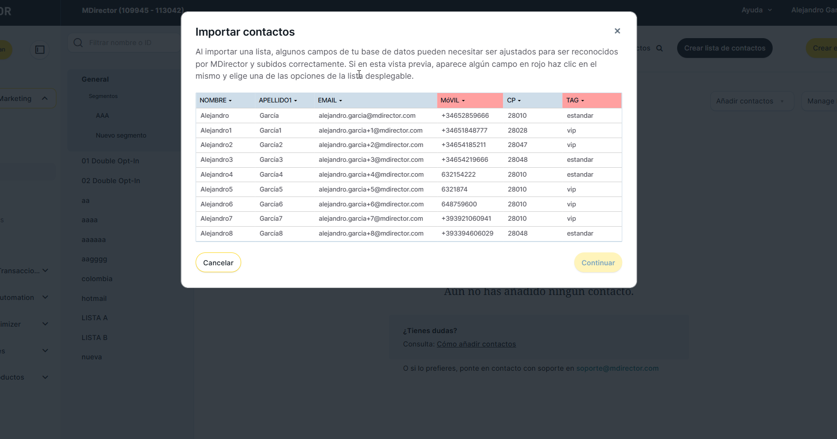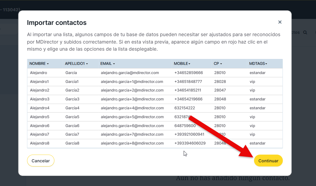 * Revise el formato de los números de teléfono móvil aquí https://mdirector.zendesk.com/hc/es/articles/9228068918556--C%C3%B3mo-importar-contactos-con-n%C3%BAmero-de-tel%C3%A9fono-m%C3%B3vil y los valores o formatos aceptados para los campos fecha, país, provincia y género en este artículo https://mdirector.zendesk.com/hc/es/articles/204780612-Tabla-de-c%C3%B3digos-Pa%C3%ADs-Provincia-Genero-y-Fecha para preparar su fichero de contactos a importar.