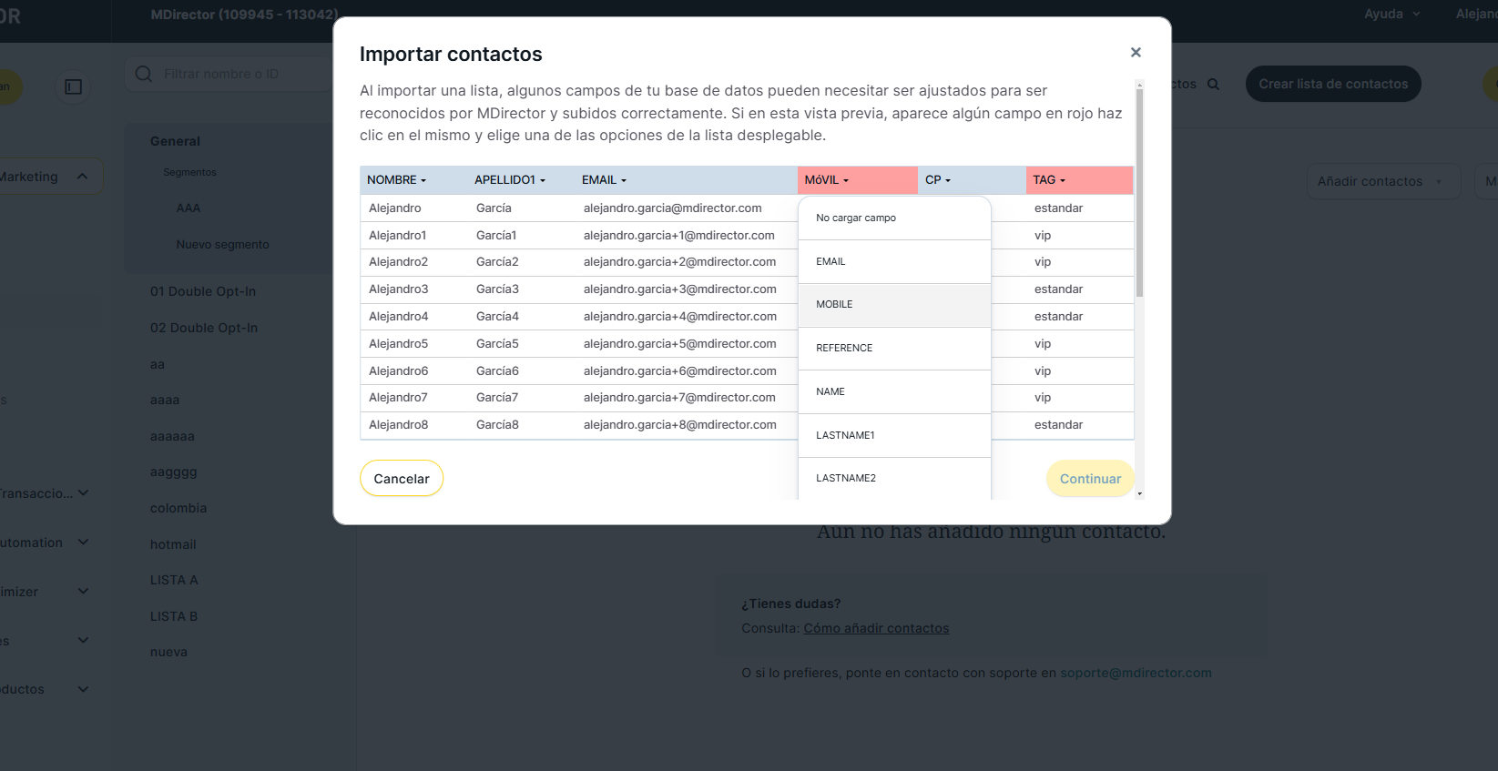 La importación de contactos a través de ficheros es la más adecuada para manejar un gran volumen de contactos y realizar una importación masiva. MDirector reconoce los campos de los ficheros y los traslada a los campos de la plataforma.