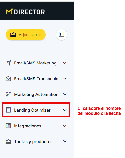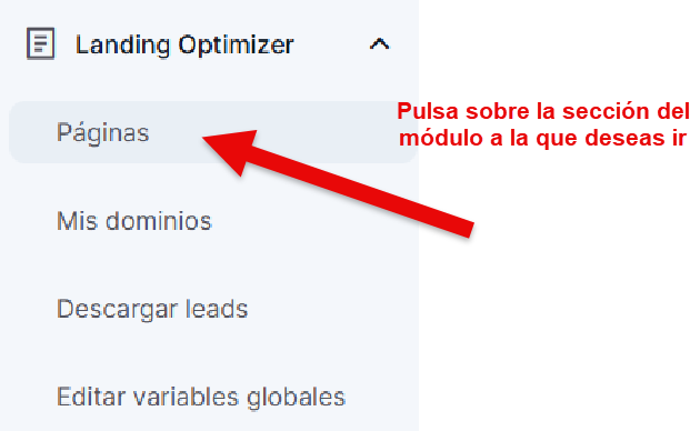 Para acceder a él, ve al menú lateral, ubicado en el lado izquierdo de tu pantalla, y, asegurándote de que este está descolapsado, clica sobre el título o la flecha a su derecha, lo que hará que se desplieguen las diferentes secciones del módulo: Páginas, Mis dominios, Descargar leads y Editar variables globales. Para entrar al módulo, tendremos que clicar sobre la sección a la que queramos viajar.