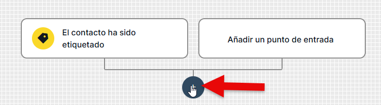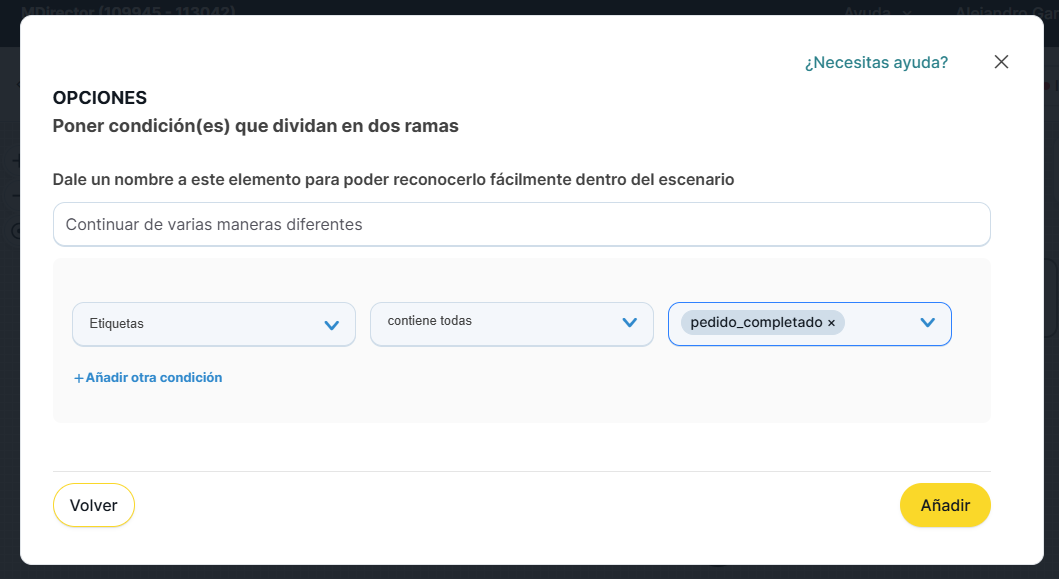 Paso 3. Agregar una condición que divida el flujo en dos. En la condición debemos definir si contiene o no la segunda de las etiquetas creadas antes, la que se refiere a que el usuario ya ha completado la compra.