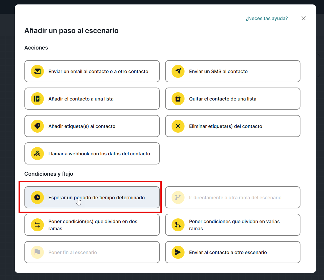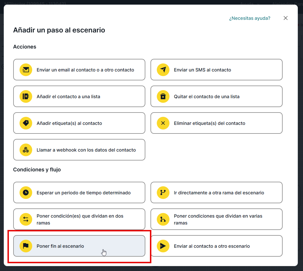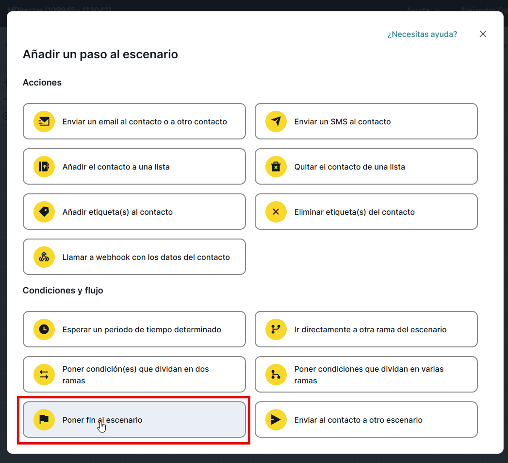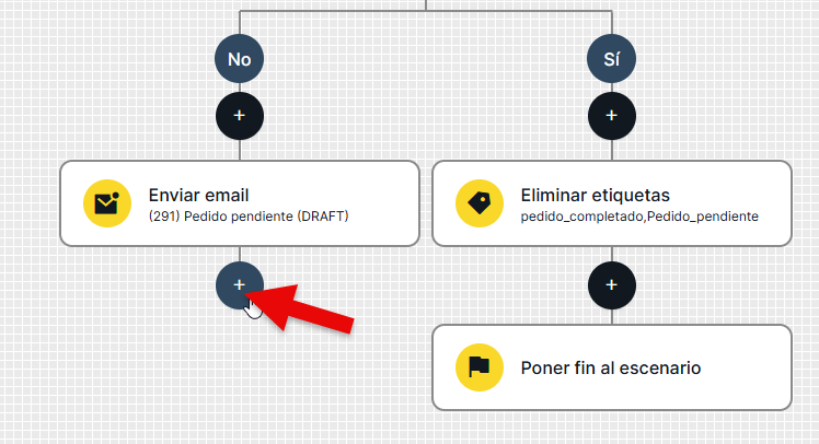 Ahora, ya podemos agregar el paso de poner fin al escenario también por este flujo. Aunque, alternativamente, también se podrían agregar más pasos con tiempos de espera para seguir enviándole más recordatorios o combinarlo con cualquier otra acción si así lo quisiéramos.