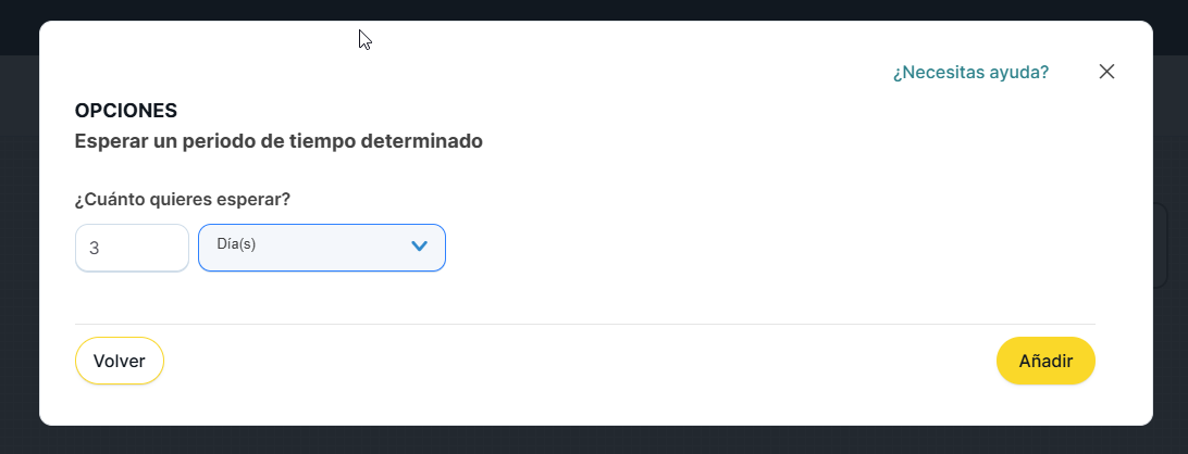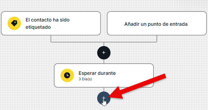 Paso 2. Agregar un periodo de espera para pasar a la siguiente acción. Esto lo hacemos para dar al usuario tiempo de que complete la compra antes de enviarle el correo electrónico recordándoselo. Este periodo puede ser de, por ejemplo, tres días.