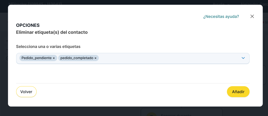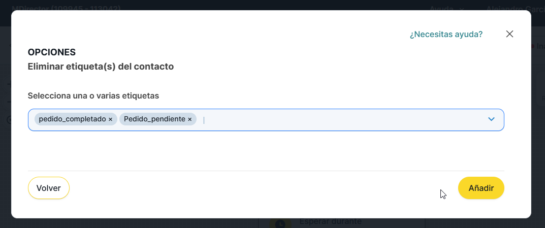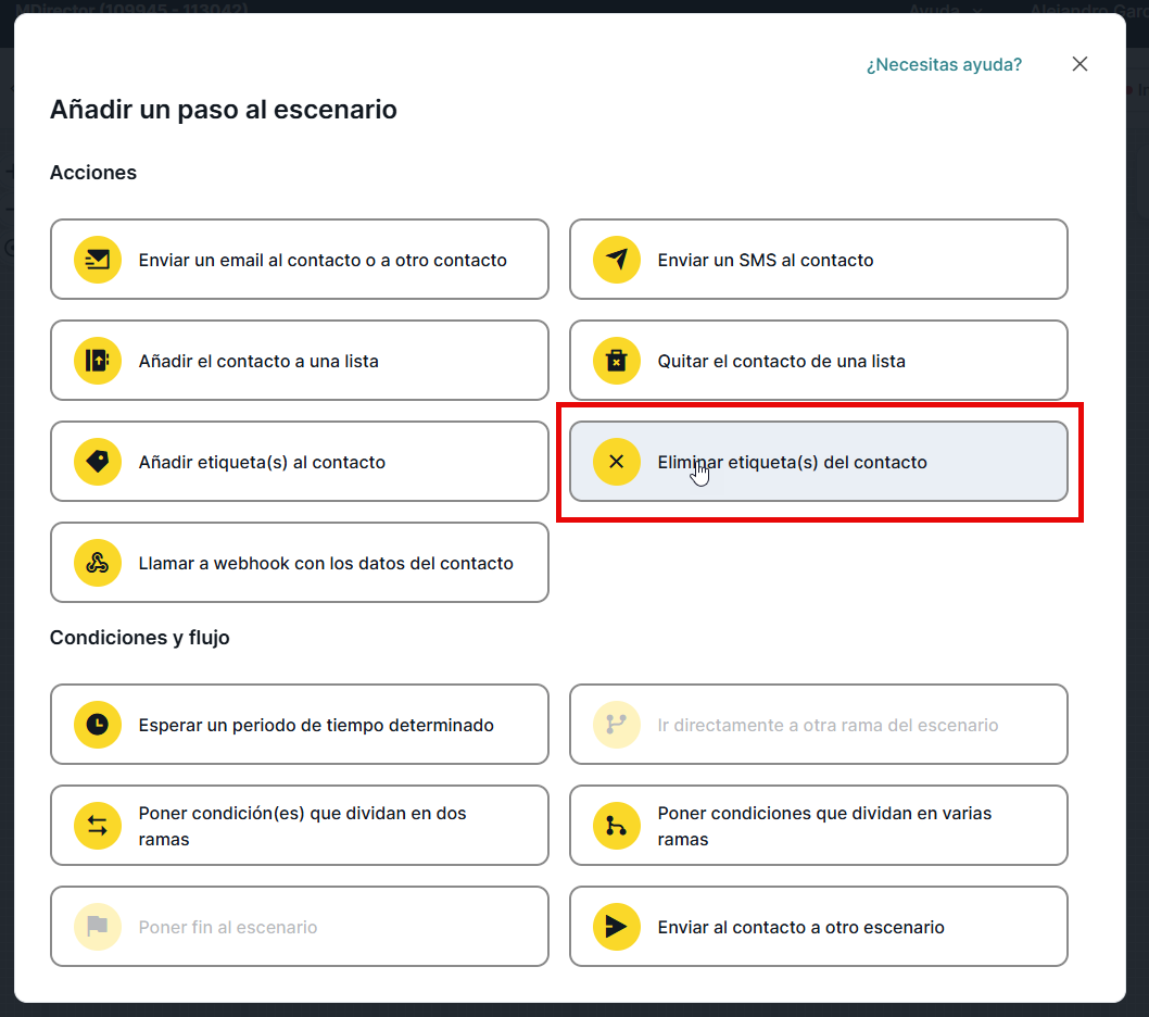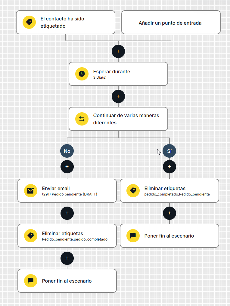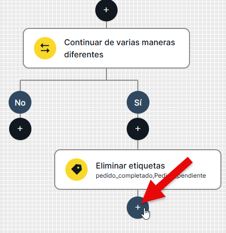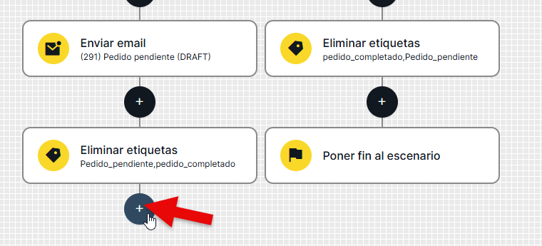 Ahora deberemos agregar un paso de eliminar las dos etiquetas, ya que, si completa la compra gracias a nuestro recordatorio, se le asignaría la segunda.