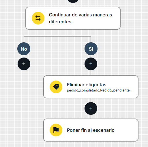 a. Por el lado de los que sí han completado la compra, agregamos el paso de eliminar las dos etiquetas y luego el de poner fin al escenario.