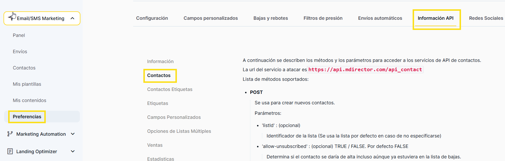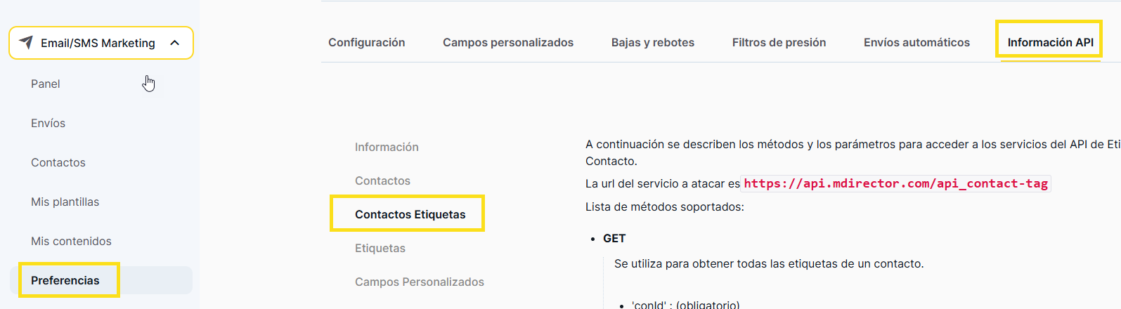 - tags - método POST con llamada a la URL: https://app.mdirector.com/api_contact-tag/