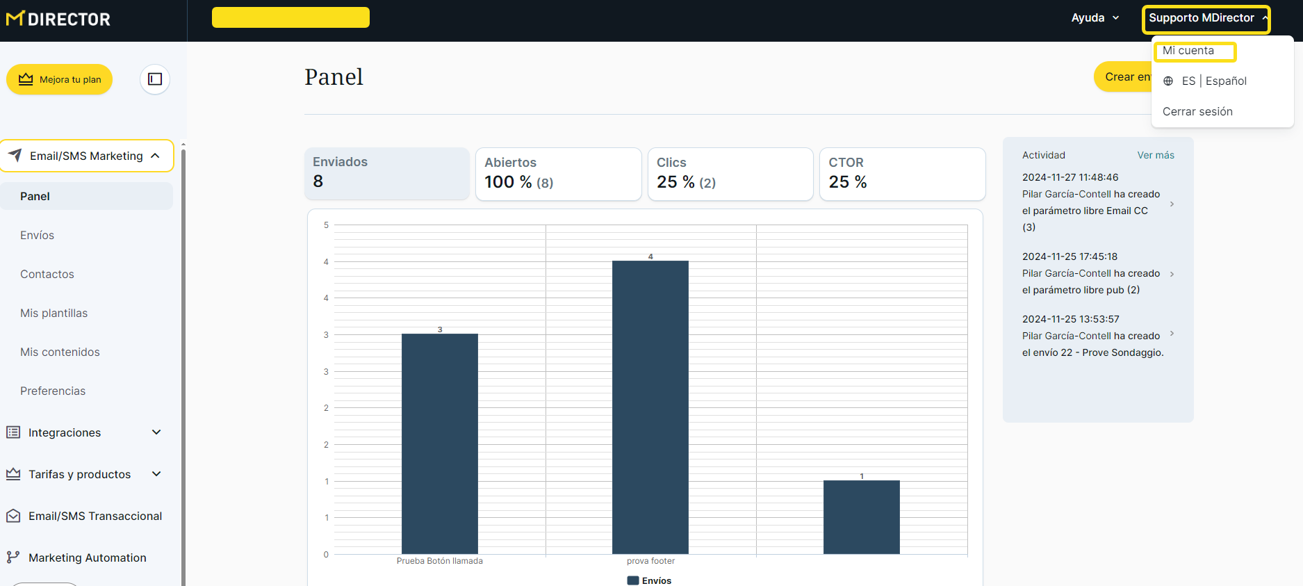 1. Haz clic en el menú usuario que encuentras en la parte superior derecha y pulsa Mi Cuenta.