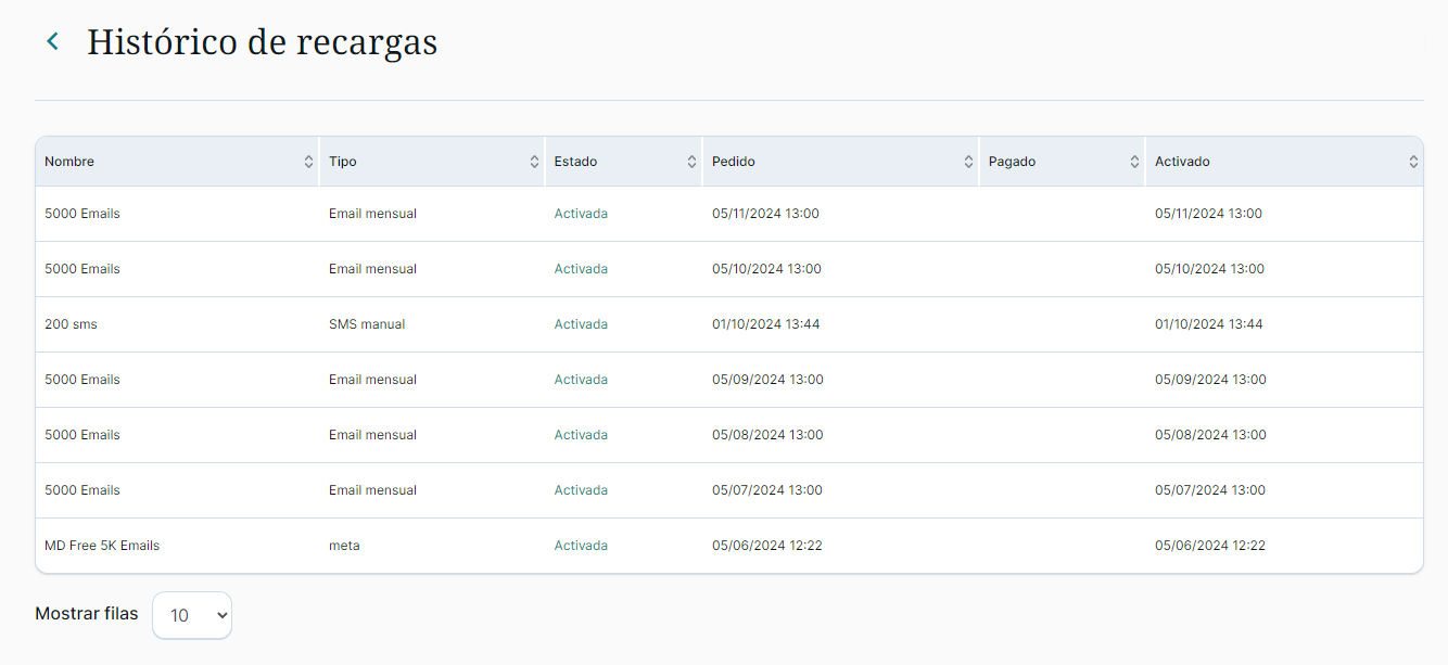 Desde aquí podrás ver las recargas que has efectuado y su estado: si ha sido activada o está pendiente de pago: