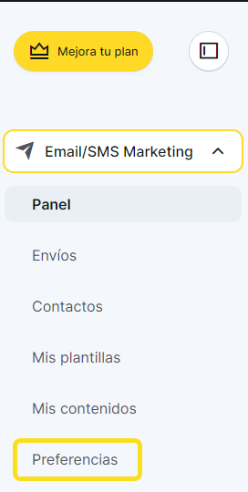1. Haz clic en "Preferencias", dentro de la sección Email/SMS Marketing del menú lateral izquierdo: