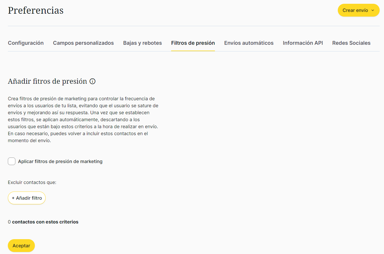 Crea filtros de presión de marketing para controlar la frecuencia de envíos a los usuarios de tu lista, evitando que el usuario se sature de envíos y mejorando así su respuesta. Una vez que se establecen estos filtros, se aplican automáticamente, descartando a los usuarios que están bajo estos criterios a la hora de realizar un envío.