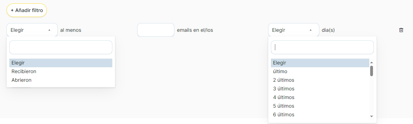 3. Haciendo clic en el botón Añadir filtro puedes definir los contactos que abrieron/recibieron un determinado número de emails en el periodo que elijas: