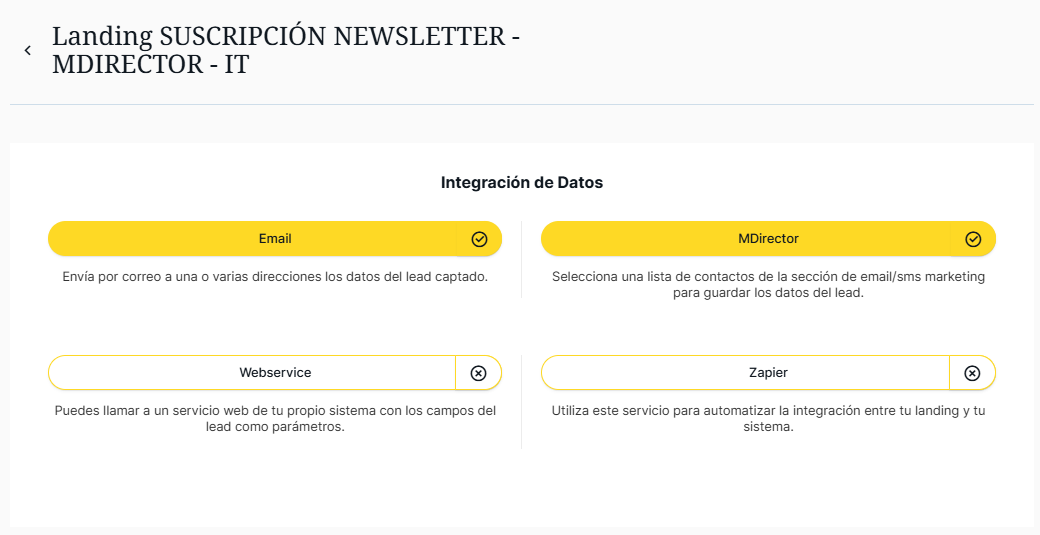 En cada landing, está marcadas con un ✓ y en amarillo las integraciones que tenga activas y con una X y en blanco las que no estés activas.