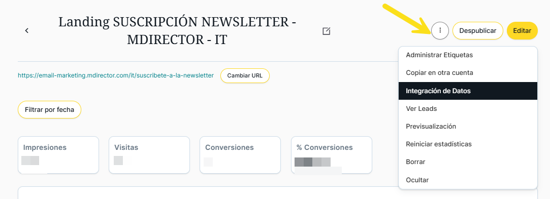 Para ver estas opciones, entra en la página de la Landing Page correspondiente, y ve al menú superior derecho, botón de acciones (el que tiene tres puntos), y selecciona "Integración de Datos":