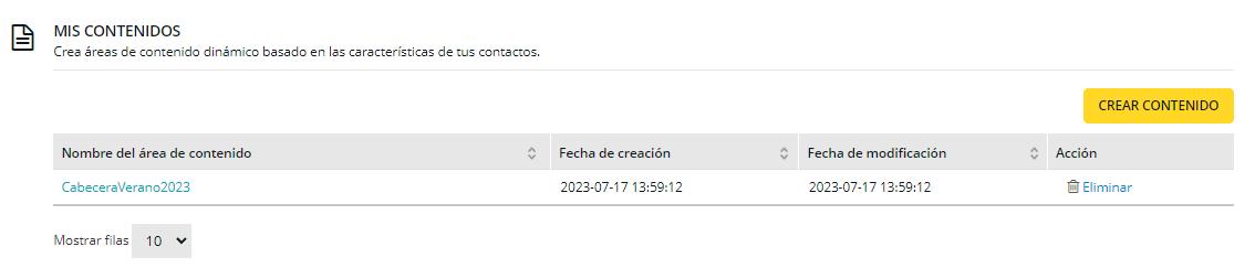 A continuación podrás ver el área de contenido que has creado en el listado de tus contenidos.