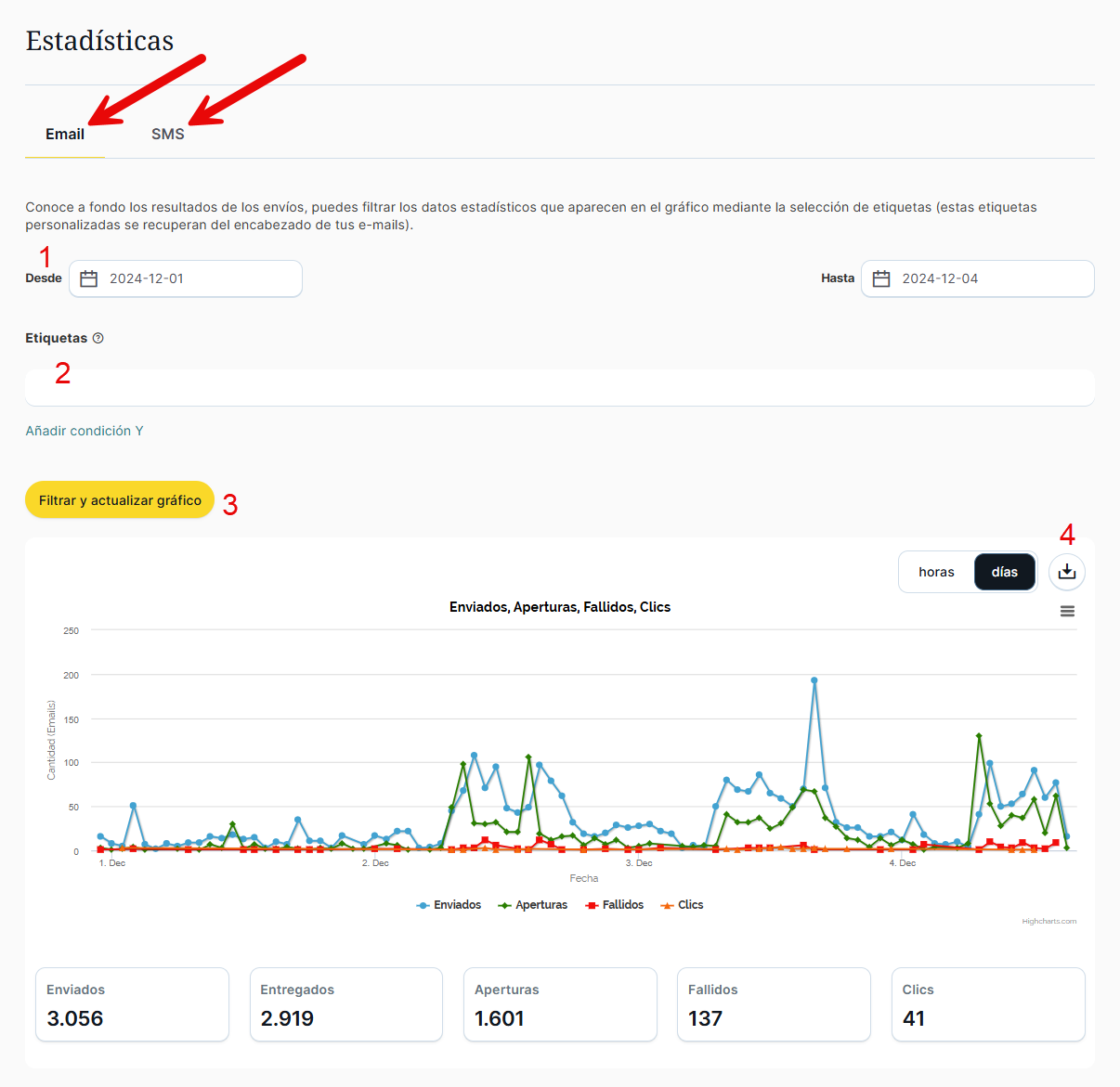 Desde la barra lateral izquierda en la sección Email/SMS Transaccional tienes la opción de "Estadísticas" en el que hay dos pestañas para ver las estadísticas de Email o de SMS (por defecto sale Email).