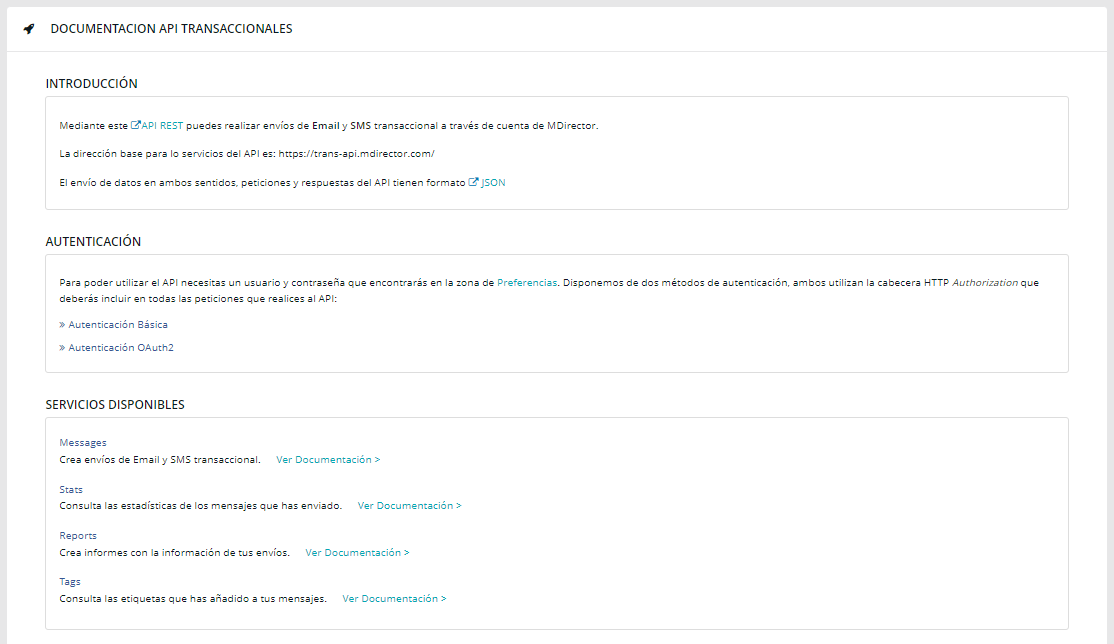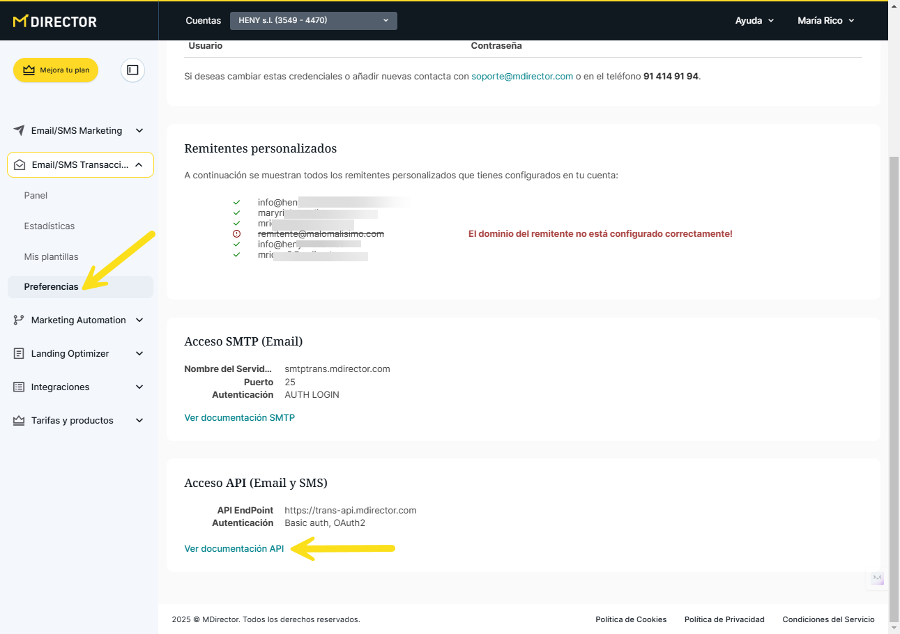 En el apartado Integraciones --> APIs de tu cuenta puedes crear usuario y contraseña de API si aún no dispones de ellos. Puedes ver aquí como hacerlo: https://mdirector.zendesk.com/hc/es/articles/17945274470812-APIs-de-integraci%C3%B3n-para-masivos-y-transaccionales