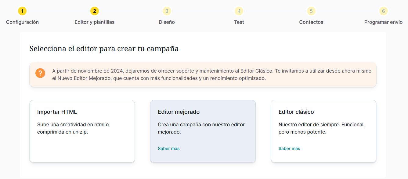 Desde el paso 2 en la creación de un envío, puedes elegir entre diseñar una plantilla nueva o bien editar una plantilla guardada previamente: