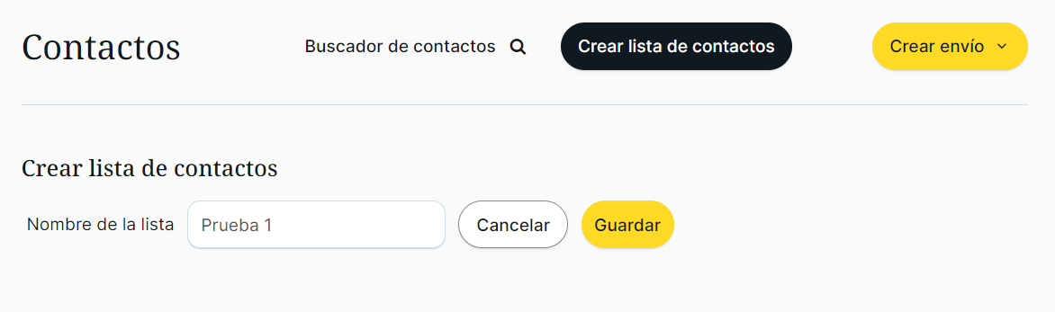 En la parte superior derecha del apartado "Contactos" encontramos el botón para "Crear nueva Lista", Añadimos el nombre de nuestra lista (recomendamos un nombre sin espacios ni caracteres especiales) y guardamos: