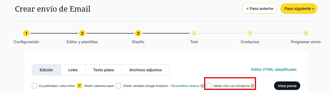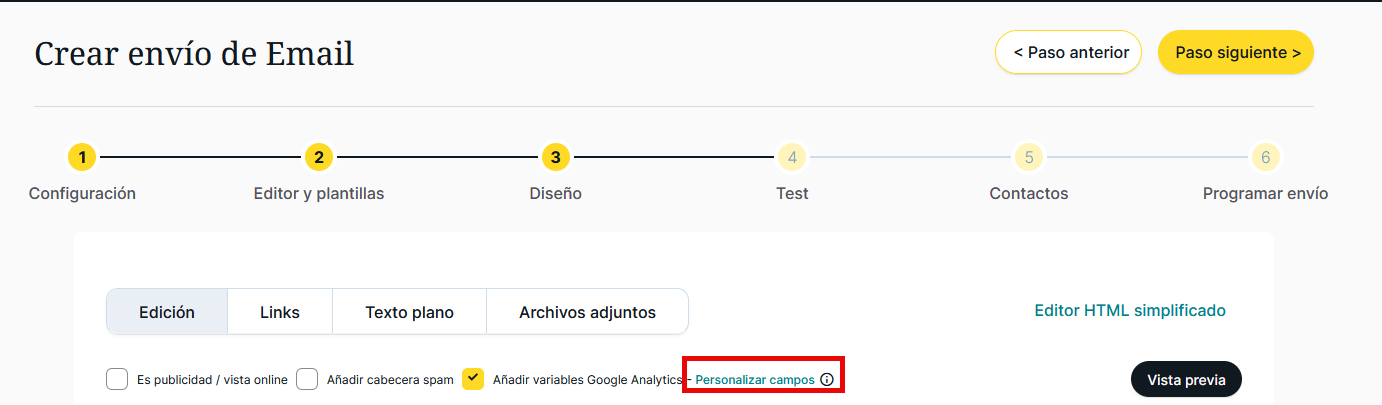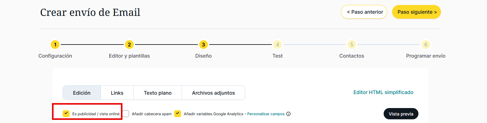 Dentro del paso 3 "Diseño" de tu envío de email marketing, verás varias funcionalidades que podrás activar y desactivar en cada envío. A continuación, te explicamos para qué funcionan cada una de ellas: