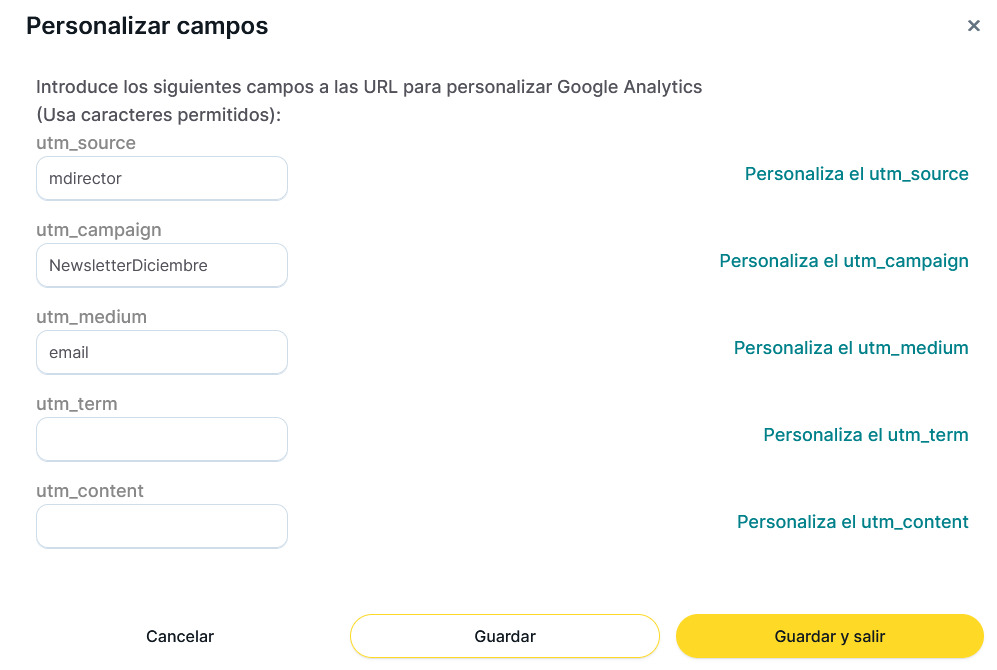 Haciendo clic en "Personalizar campos" podrás, si lo deseas, agregar nuevas etiquetas a tus URL. Cuando los usuarios hagan clic en uno de los enlaces personalizados, tus parámetros exclusivos se enviarán a tu cuenta de Google Analytics (https://mdtr.io/sioF3), de modo que puedes identificar las URL que resultan eficaces para atraer a los usuarios a tu contenido.