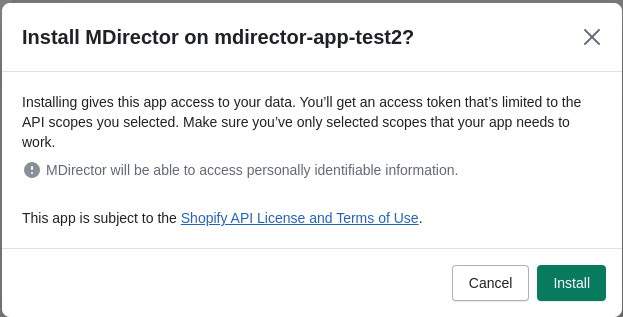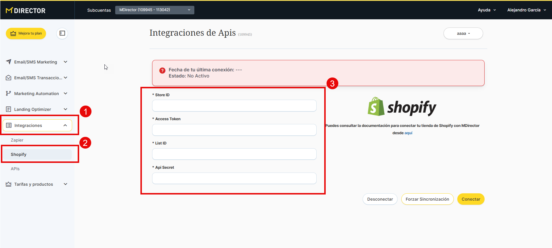 - Al desconectar la aplicación se borran todos los datos por lo que es aconsejable guardar la información de API tanto de Shopify como MDirector antes de descontectar.