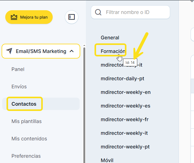 - List ID: Es el identificador de la lista a la que se quiere enviar los contactos de Shopify a MDirector. Puedes consultar el identificador de cada lista manteniendo el cursor del ratón encima del nombre de la lista, tal como te mostramos a continuación: